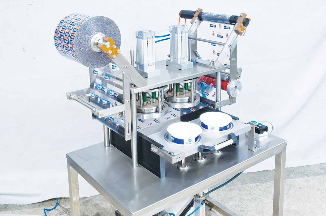 تُثبت اللفائف التي تأتي على شكل رولات على بكرة الآلة، حيث يتم لف الفويل المستخدم من الجهة الأخرى. يتم إدخال الأوعية الموضوعة في الحوض داخل الآلة، ثم يتم الضغط على زر البدء. أثناء عملية لصق الفويل، يتم تنفيذ عملية القطع في نفس الوقت. بعد إتمام اللصق، يتم أخذ الأوعية الملتصقة يدويًا من الحوض.